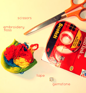 Step 1: Gather materials. Needed are scissors, four colors of embroidery floss, tape, and a gemstone with a setting; I got mine from a broken necklace.