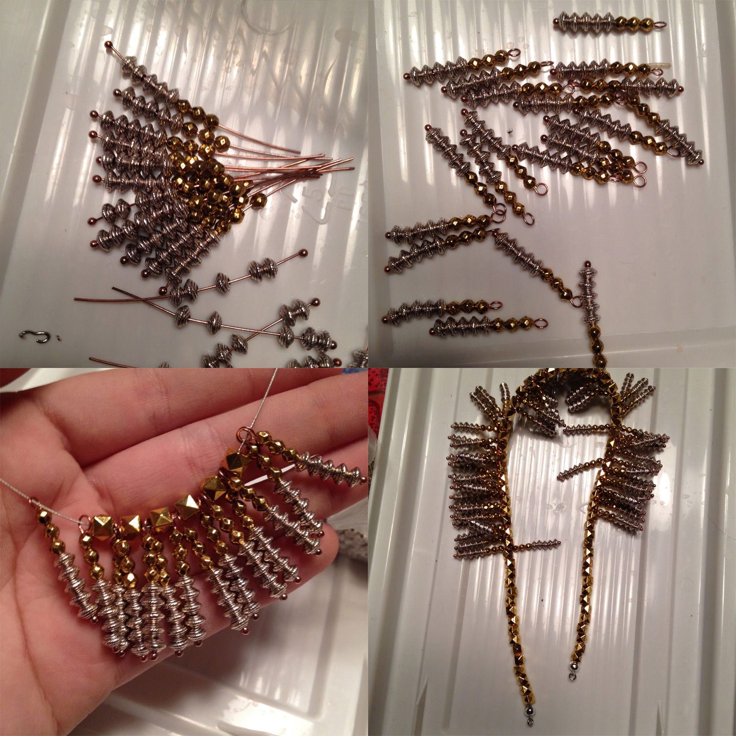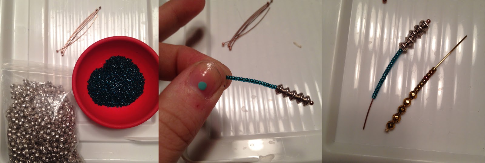 There are many different combinations for this necklace; try out combos on headpins and see which you like best! I originally was pair the silver discs with teal seed beads; but then, switched to these faceted gold beads for a shiner look. The rightmost picture was me figuring out what beads I wanted! I can think of so many combinations that would look smashing, and more necklaces will be coming soon!