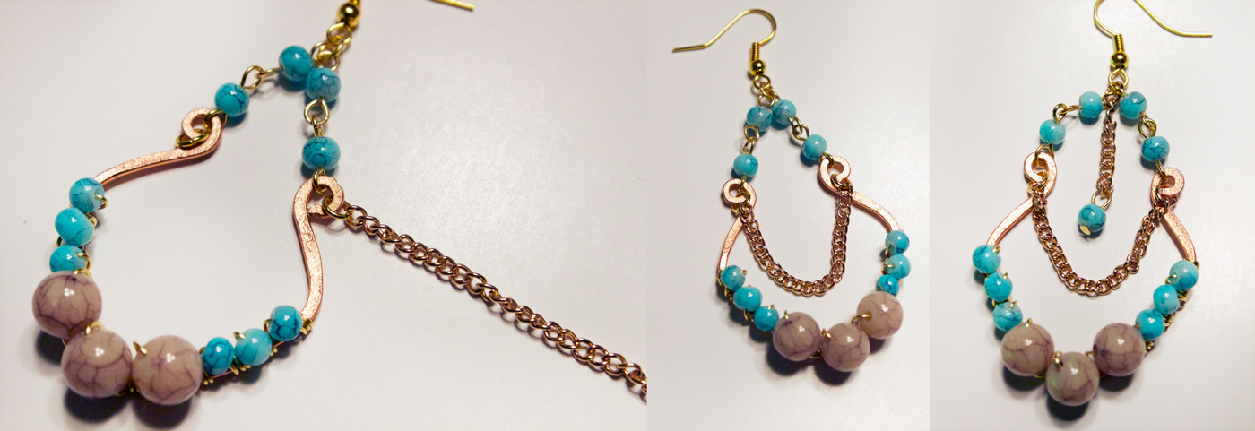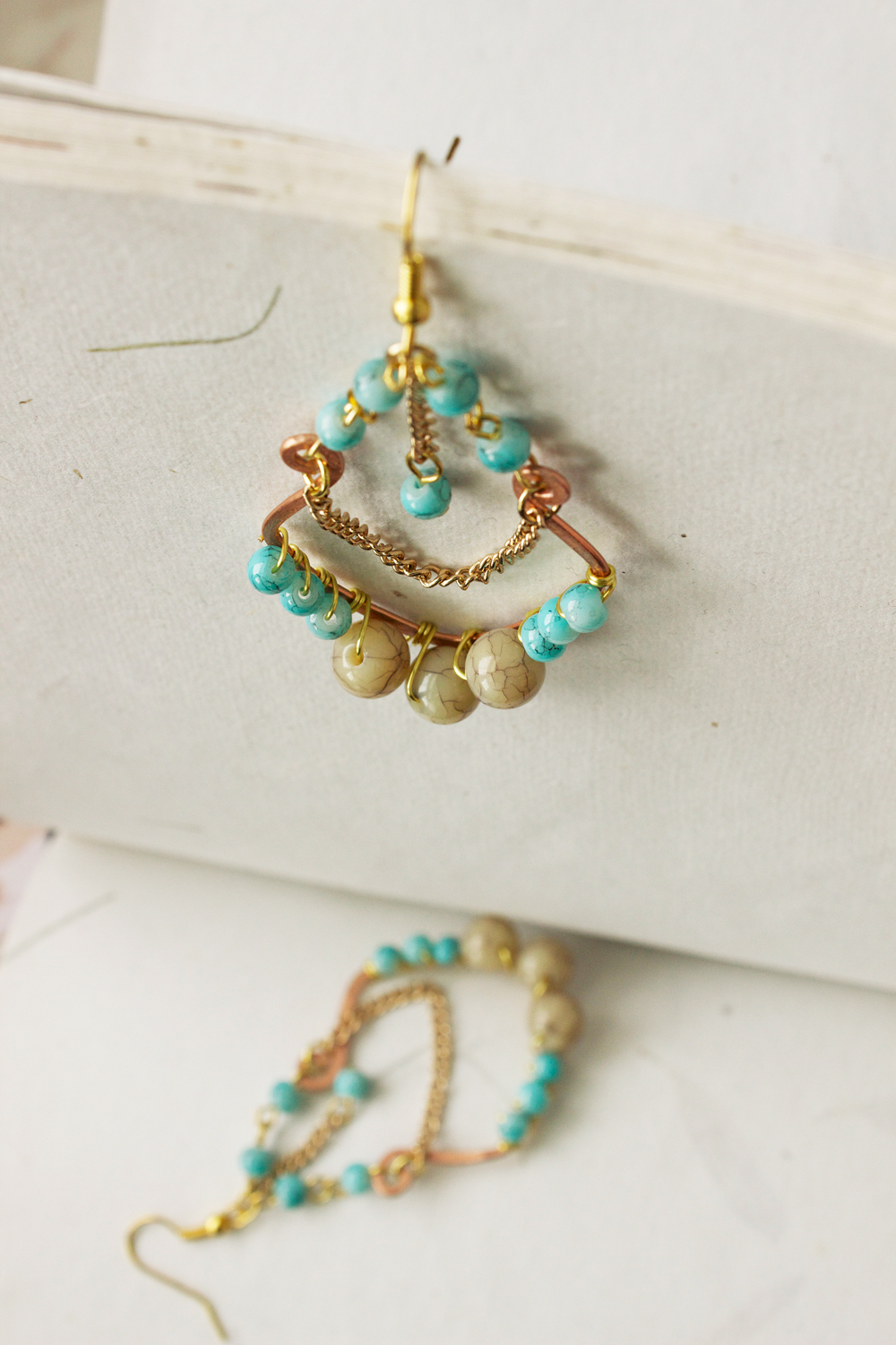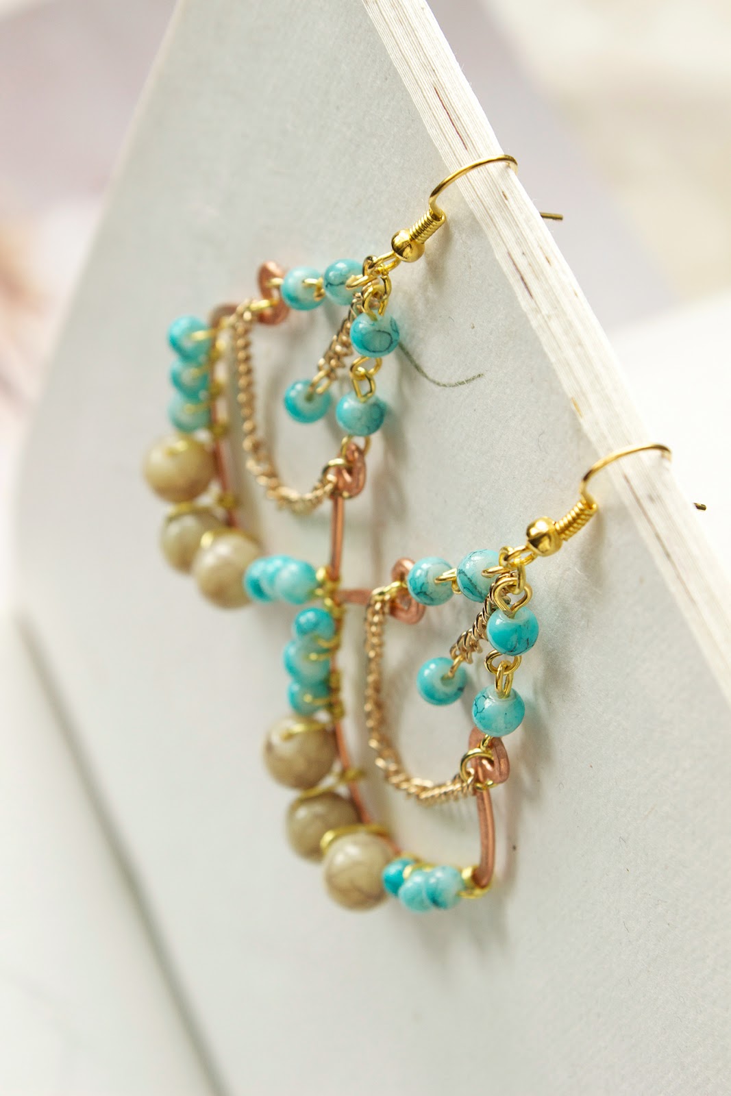 When I first got these turquoise and howlite rounds from bead store PandaHall.com, I knew I wanted to create something with a more neutral color palette. My love for mixed metals spurred the chandelier earring idea, thinking that copper and gold, both "warm" colors, would blend well together.