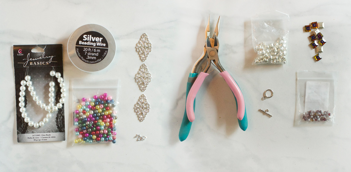 Step 1: Gather materials. You need acrylic pearls (I used large 8mm pearls from Cousin Corp Jewelry Basics and colored Pandahall pearls), glass beads (specifically 4X3mm silver plated faceted glass abacus crystals), assorted filigree findings (similar bronze filigree here , filigree here or sterling filigree components here ), silver crimp tubes, 6mm crimp covers , a toggle clasp, Swarovski square sew-on rhinestones (emerald rounds here , or aquamarine rounds here , crystal square ones here) and wire cutters / flat nose pliers.