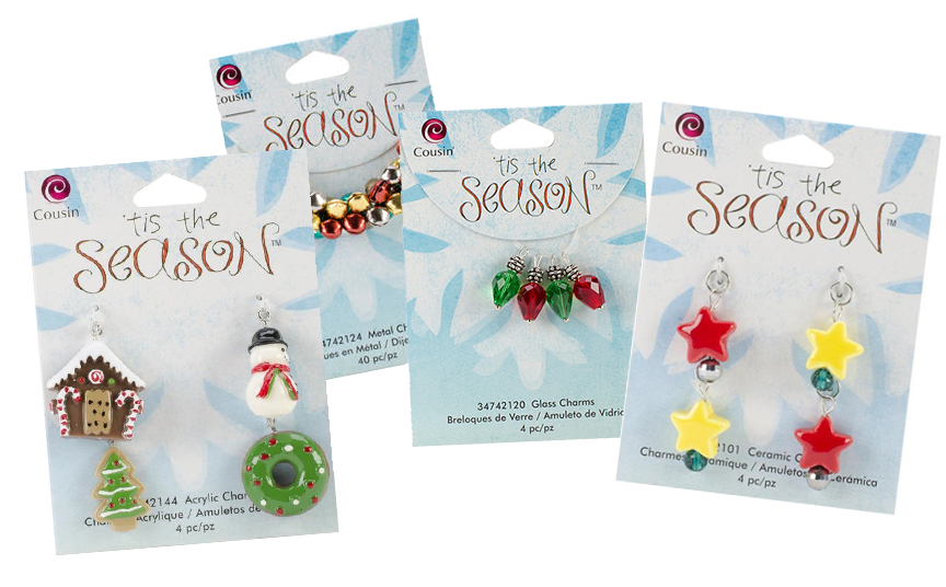 Wha-wha-what?!! It’s almost July, which means it’s time for a little “Christmas in July” cheer. I’ve got a roundup of 5 projects I’ve created with a sampling of the NEW Cousin Tis the Season 2014 line. This picture above IS NOT from the new 2014 collection; I’m just totally forgot to take pictures when I had the products, silly me. The new line is going to be available at Cousin.com and craft stores like Michael’s and JoAnn. Get ready for all-new packaging and products that will totally have you inspired to get crafting. From bead strands, charms and bells to pendants and more, check your local craft store starting July 1st for the new lineup.