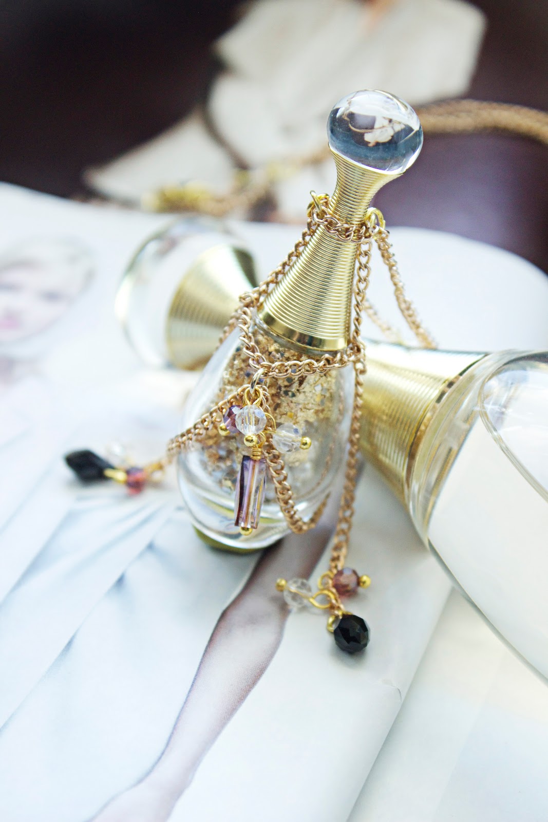 I adore Dior. With the same spirit as my other Chanel Potion Necklaces, this Dior Potion Bottle combines a luxury perfume bottle, crystals, gold flake, chain and more to create what I think is the ultimate form of recycling! This bottle was from a mini sample of Dior perfume- I knew this could not just go into the garbage, that it had another purpose.