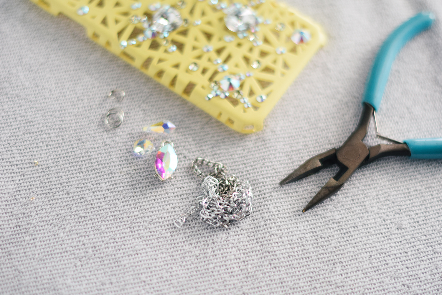 Step 1: Gather materials. Needed are phone cases, mixed flatback crystals (mine from Swarovski)
