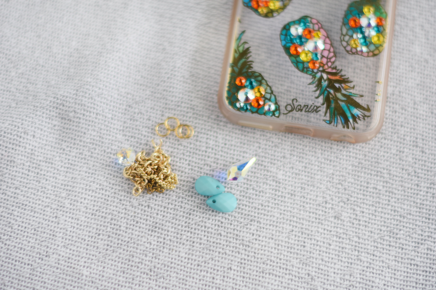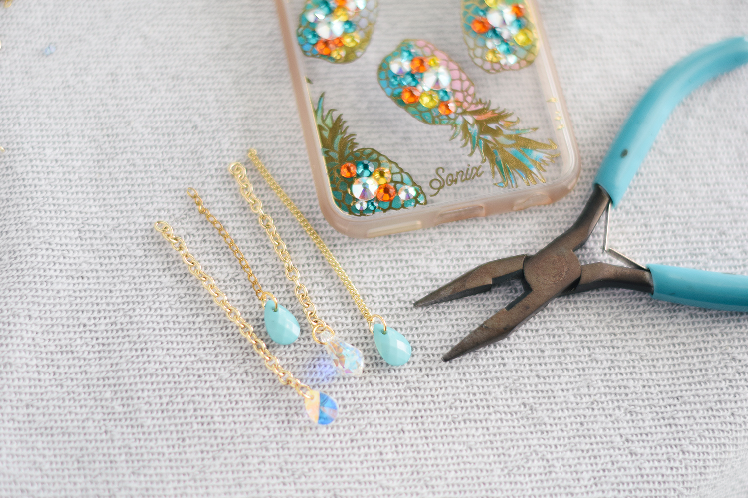 , silver or gold chain, 6mm and 10mm jump rings (silver or gold) and an assortment of crystal pendants or charms (celestial mix here, large assorted pack here) for the bottom dangle. Pliers will be needed to add the chain dangle- ( love this pack of jewelry-making pliers as it has all you need).