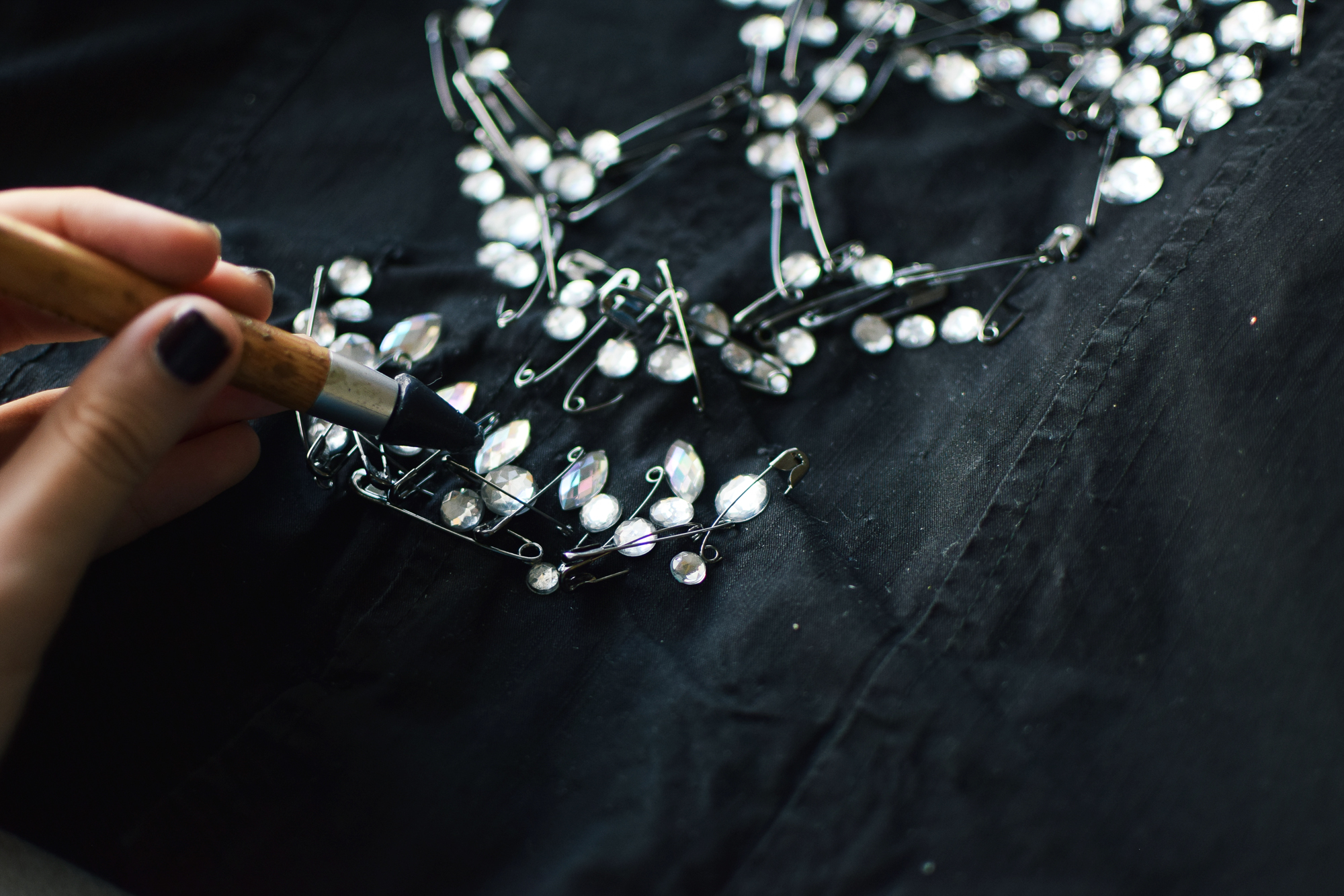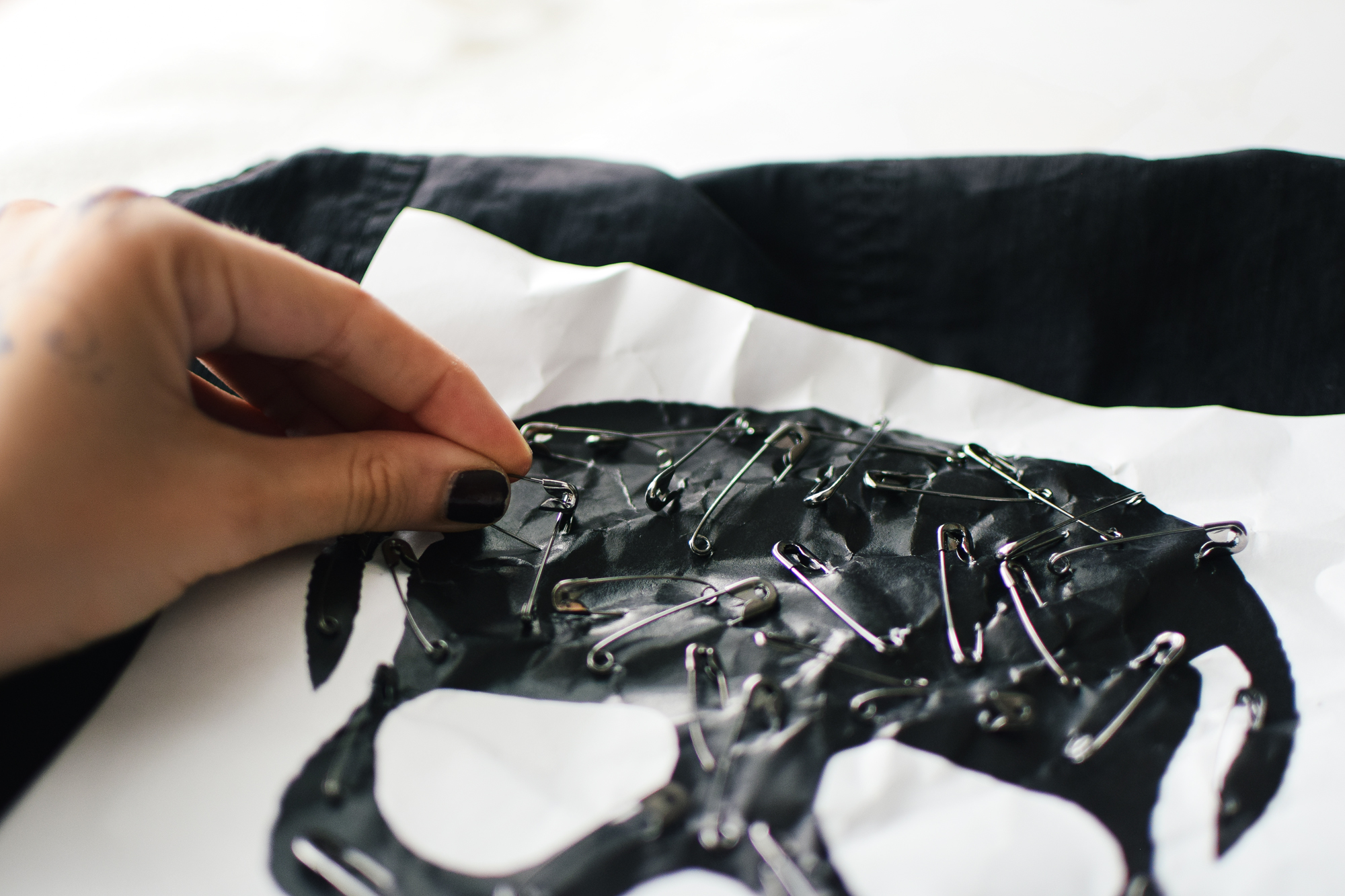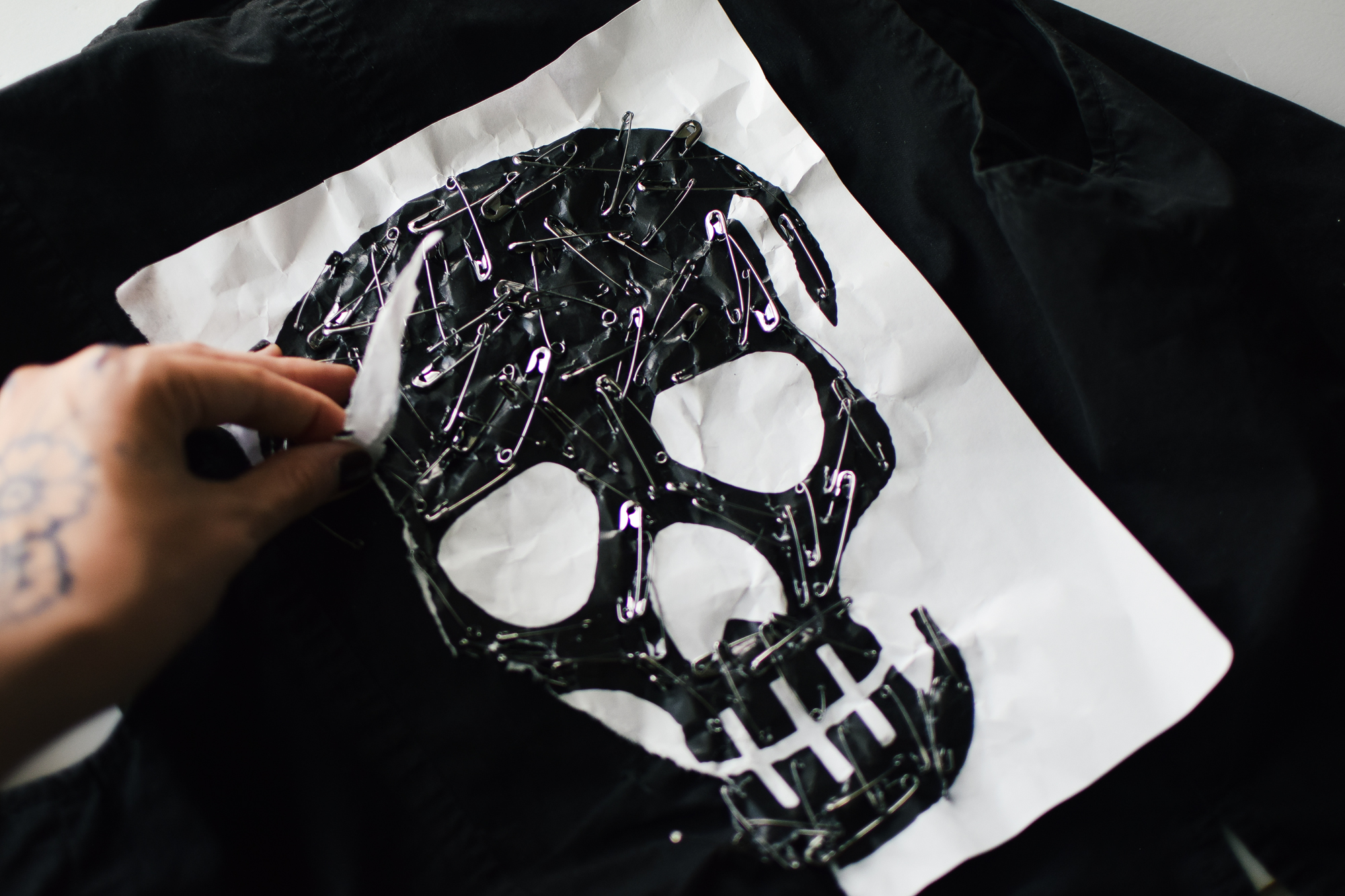 Step 1: Gather materials. You’ll need a vest or jacket, safety pins, a printout of a skull (or other stencil you want to trace), flatback gems and GemTac or fabric glue.