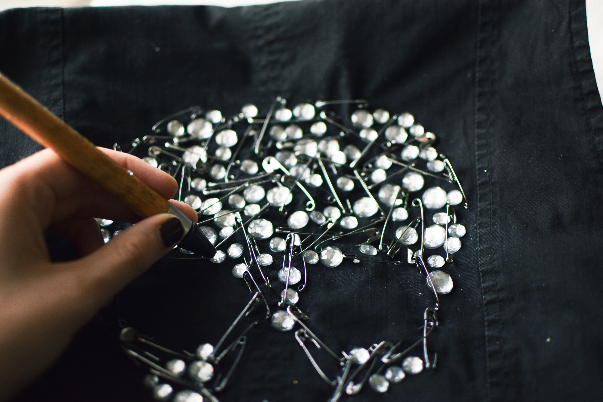 Step 3: Continue adding safety pins around the skull, filling in all the gaps. Use large, medium and small size pins