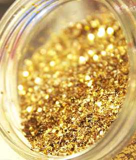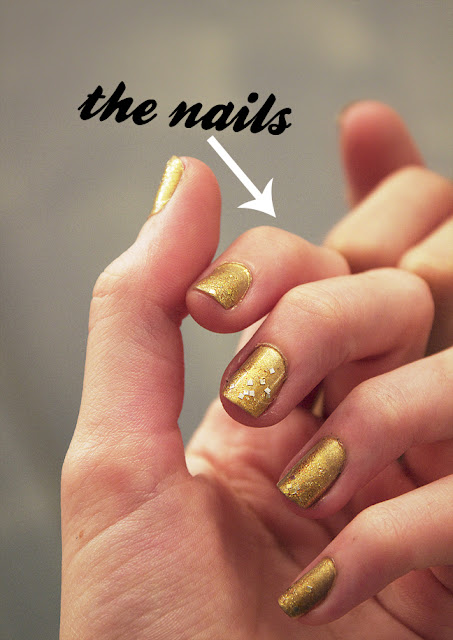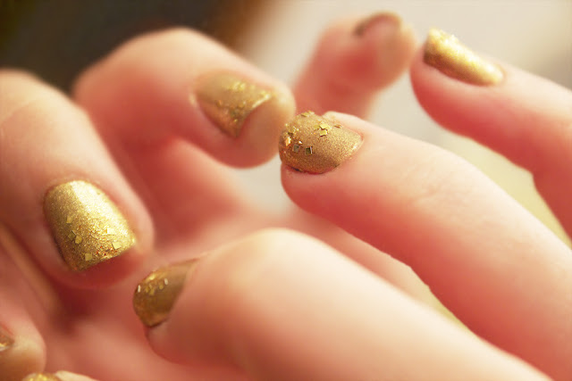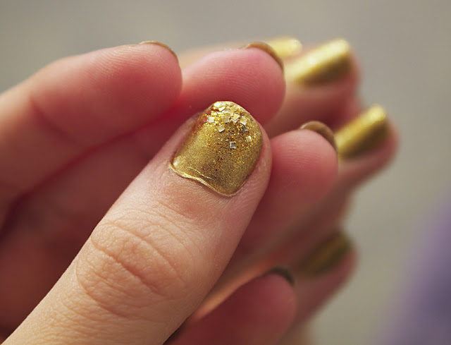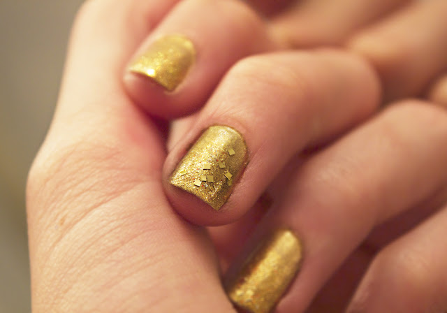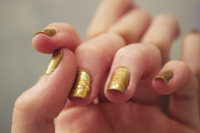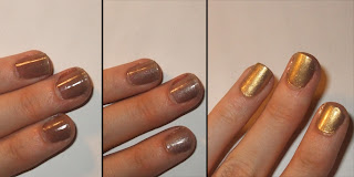 Step 3: With the gold glitter nail polish, take a small glob and paint evenly only the top 2/3rds of your nail, leaving the bottom third the plain gold color.