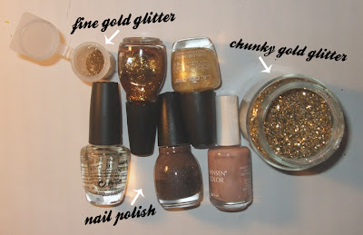 Step 1: Gather materials. Needed are clear nail polish, a taupe (I used Sinful Colors Nirvana), a shimmery beige (I used Sally Hansen #4453), a shimmery gold (I used LA Colors Seashell), a gold glitter (I used Sinful Colors All About You), fine gold loose glitter and chunky gold glitter.
