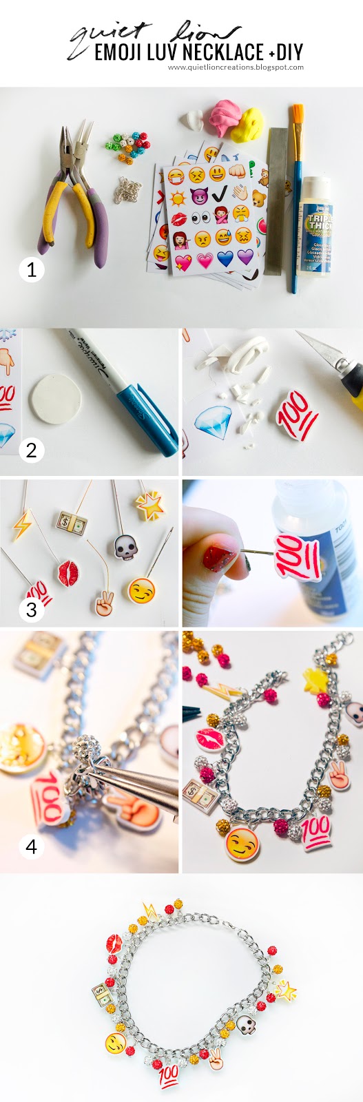 Are you lovin’ this as much as I am? I like the contrast between the fancier sparkle beads, fun icons and industrial-type chain. What’s also great is that you can switch up the colors based on the emojis you pick. You could also use gold chain instead of silver if you prefer.