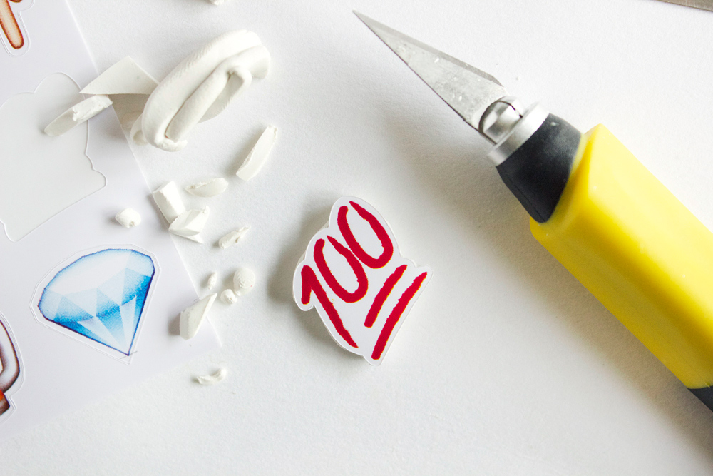 Step 1: Gather materials. Needed are pliers, polymer clay, a tissue blade or Xacto knife for cutting, clear gloss glaze, a paintbrush, pave rhinestone beads, chain, a clasp, headpins, and the pièce de résistance - the Emoji stickers. I got these from Target! You can also get them from Amazon and Urban Outfitters.