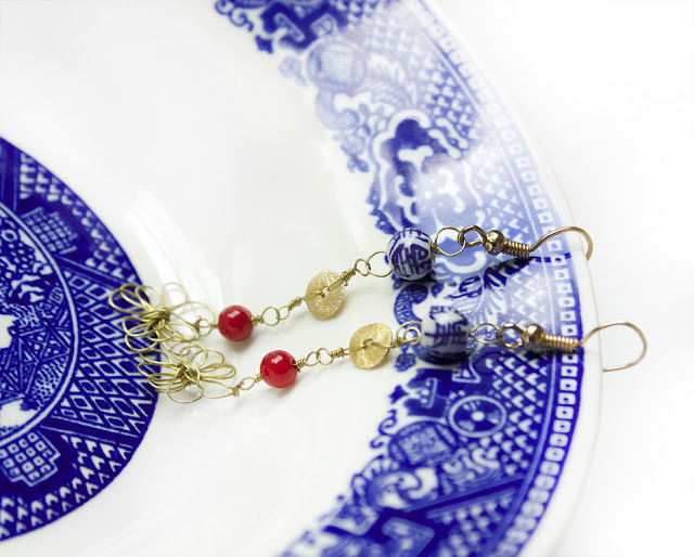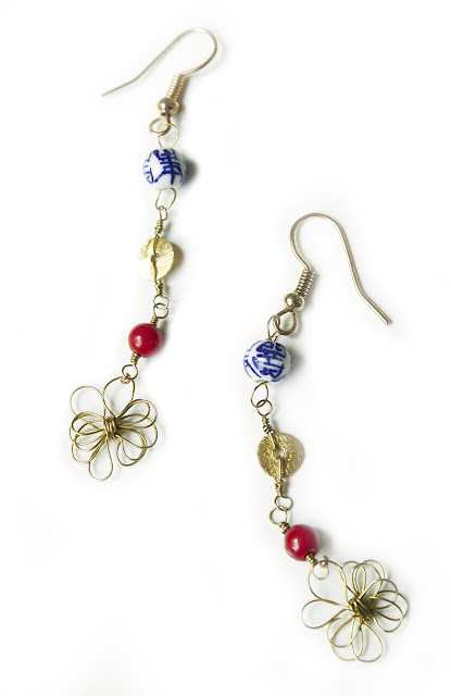 Here is the more wearable version, in earring form. These earrings are super lightweight and also are very dainty. I took heed to to the abstracted flowers and made a wire flower as the focal point. I then used red, a color from the collection, and added some gold accents with the beads and wire.