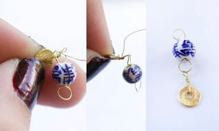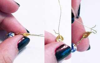 Step 5: Thread your disc bead through the wire, and bend the wire back up, wrapping it right next to the beginning to close. The disc should be lying flat, instead of sticking out horizontally.