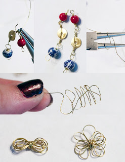 Now, to make the wire flower, simply weave about a 6″ piece of wire in and out of your roundnose pliers, ’till you have what we see in the middle picture. Compress this spring, and use the end of the wire to wrap around the middle, bundling the wire (bottom left). Now, spread out the individual “petals” by gently pulling up or down, until your flower is finished out! Simply attach the loop of the 6mm bead to an earwire, and then attach your jumpring to a petal of the flower, then the loop from the 4mm link to finish!