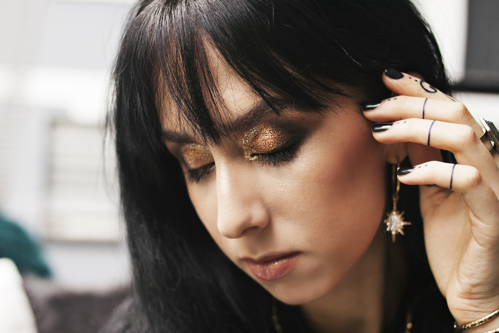Special thanks again to Schaumin, @TheJamericanBeauty, for her makeup artistry. She went with a glam, golden glitter smoky eye to bring out the holiday glitz!