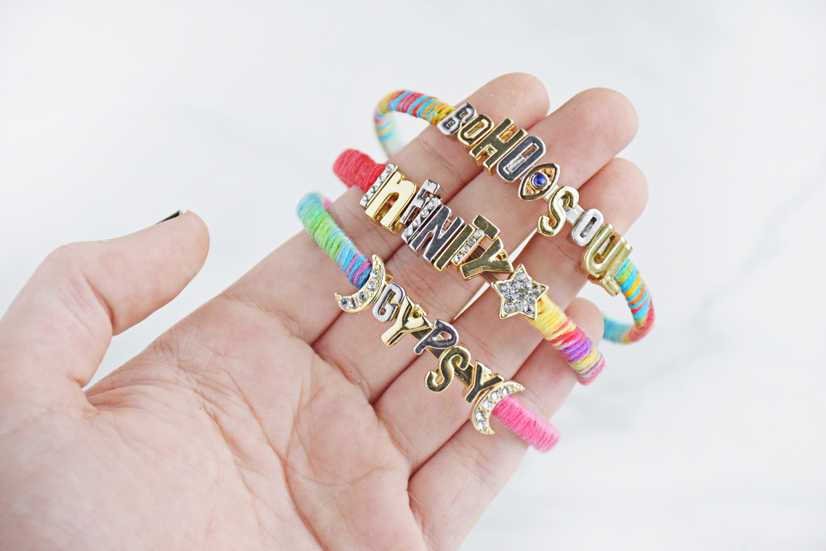 Step 1: Gather materials. You will need embroidery floss, rhinestone alphabet sliders (or any kind of alphabet slider bead — mix metals for a bohemian feel!), plain skinny bangle bracelets and super glue.