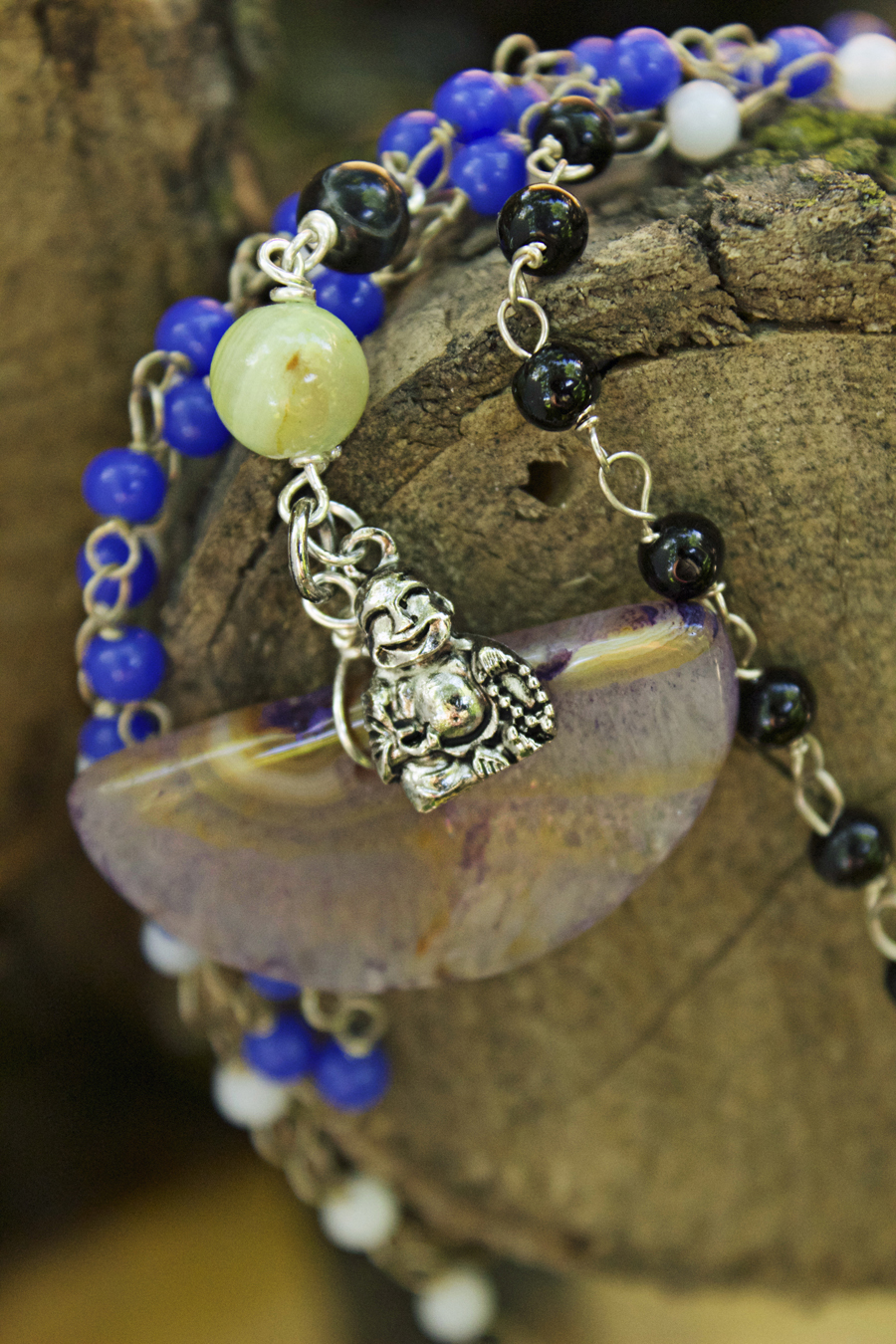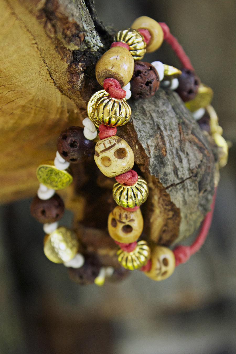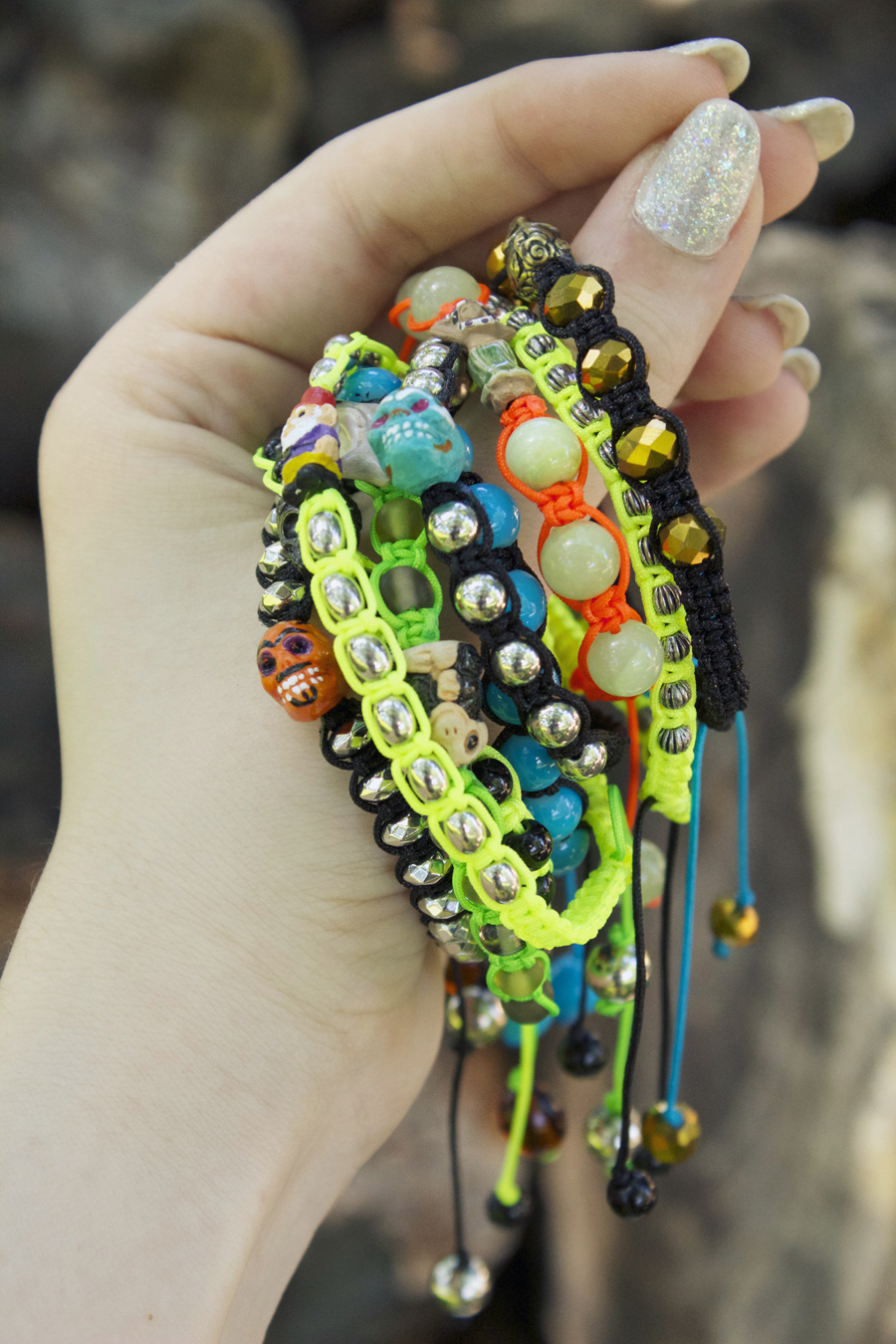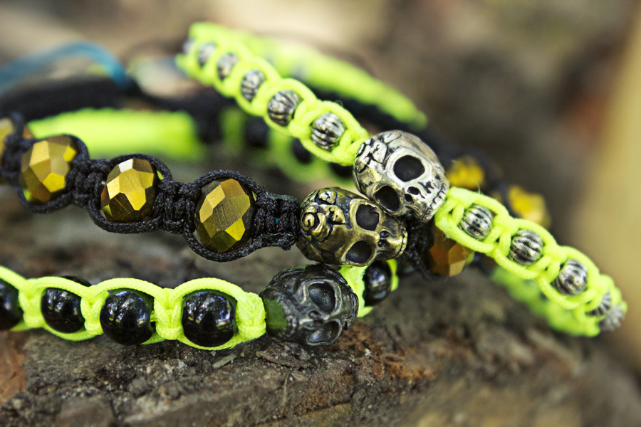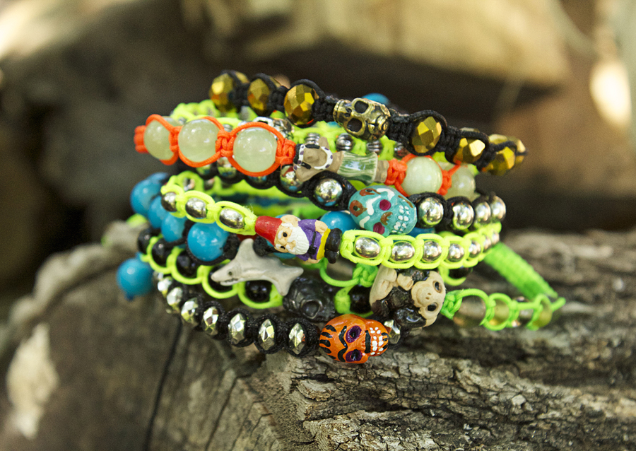 I was inspired by these little character beads to make a fun but still “manly” group of macrame stacking bracelets. A mixup of other materials adds to the collection.