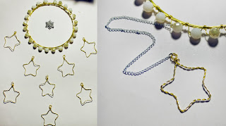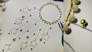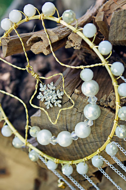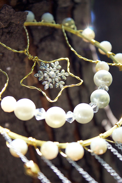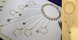 Attach them in this pattern; 8″ star in the middle, followed by the 7″ piece. Like a mirror, add the 5″ snowflake piece on either side of the middle, then the 5.5″ stars, then the 4.5″ stars, then the 3.5″ snowflakes, then finally the 2.5″ stars. Attach all these with your jumprings to the wire loops you made when wire wrapping (in between each bead, not connecting them to the thick frame itself. It should look like this above.