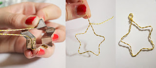 Step 2: Cut about a foot of your gold wire. Twist it like in my UO Heart Necklace (below) but DO NOT fold in half into a “V”. Instead, form around your cookie cutter, and with the excess wire create a top wrapped loop. Cut flush. Make 8 stars.