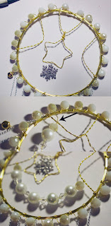 Step 9: Repeat Step 8, and add this piece to the other side (shown in first picture). Make one more piece, but only using 3″ of wire, thread on your last star charm, and attach to the top as shown. Add your snowflake charm to the middle of this star charm with a jump ring. Lastly, cut about 6″ of wire, and bead on alternating white pearls and 4mm clear crystals (I used 5 pearls and 4 crystals). Wrap this around your leftmost twisted wire decoration (second picture), then wrap around your other side to finish (last picture). You are finished!