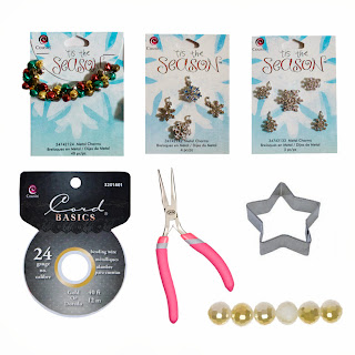 Step 1: Gather materials. Needed are pliers, a small star cookie cutter (about 2″ wide or so), 24G Gold Cousin Brand Wire, Jingle Bell Charms (mine from Cousin Corporation), Snowflake Charms (mine from Cousin), and 8mm Round Faceted Beads (mine from Cousin Corporation) and jumprings.