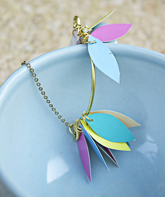 Step 3: Take your wire, cut about 4". Loop one end with pliers, bend into a U shape, and loop the other side. Depending on how big you want your pendant, and how many petals you want, you can cut less or more of the wire. Poke holes through the top of the paint chips. Quickly coat the chips with a thin layer of gloss, for shine and protection.
