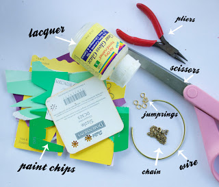 Step 1: Gather materials. Needed are paint chips, scissors, lacquer, pliers, jumprings, chain and thick wire (not sure what gauge, it doesn't totally matter either. Just make sure it's not too bendable).