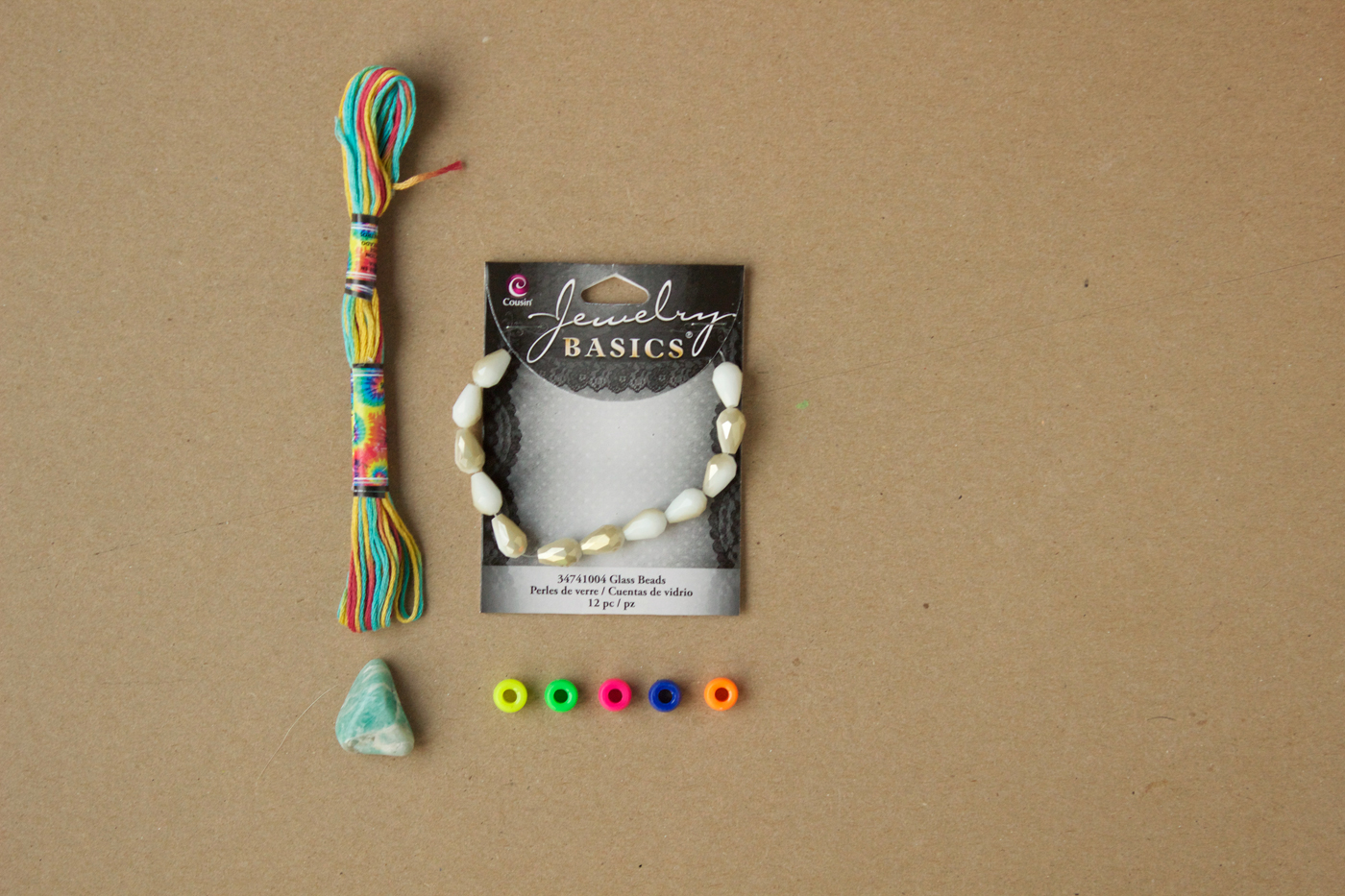 Step 1: Gather materials. You will need embroidery floss, pliers, gemstones - if you don't have a stockpile like I do, you can get a tumbled stone mix from Amazon, pony beads (mine from Cousin), crystal teardrop beads (mine from Cousin Jewelry Basics), jump rings, headpins and scissors.