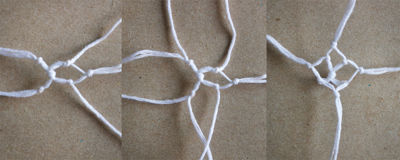 Now, divide these pairings into individual strings - tie the center two together. Divide these pairings on the lefthand side so you have four separate strings again. Tie each to the one next to it. Look at the picture for help! You should have a little diamond shape.