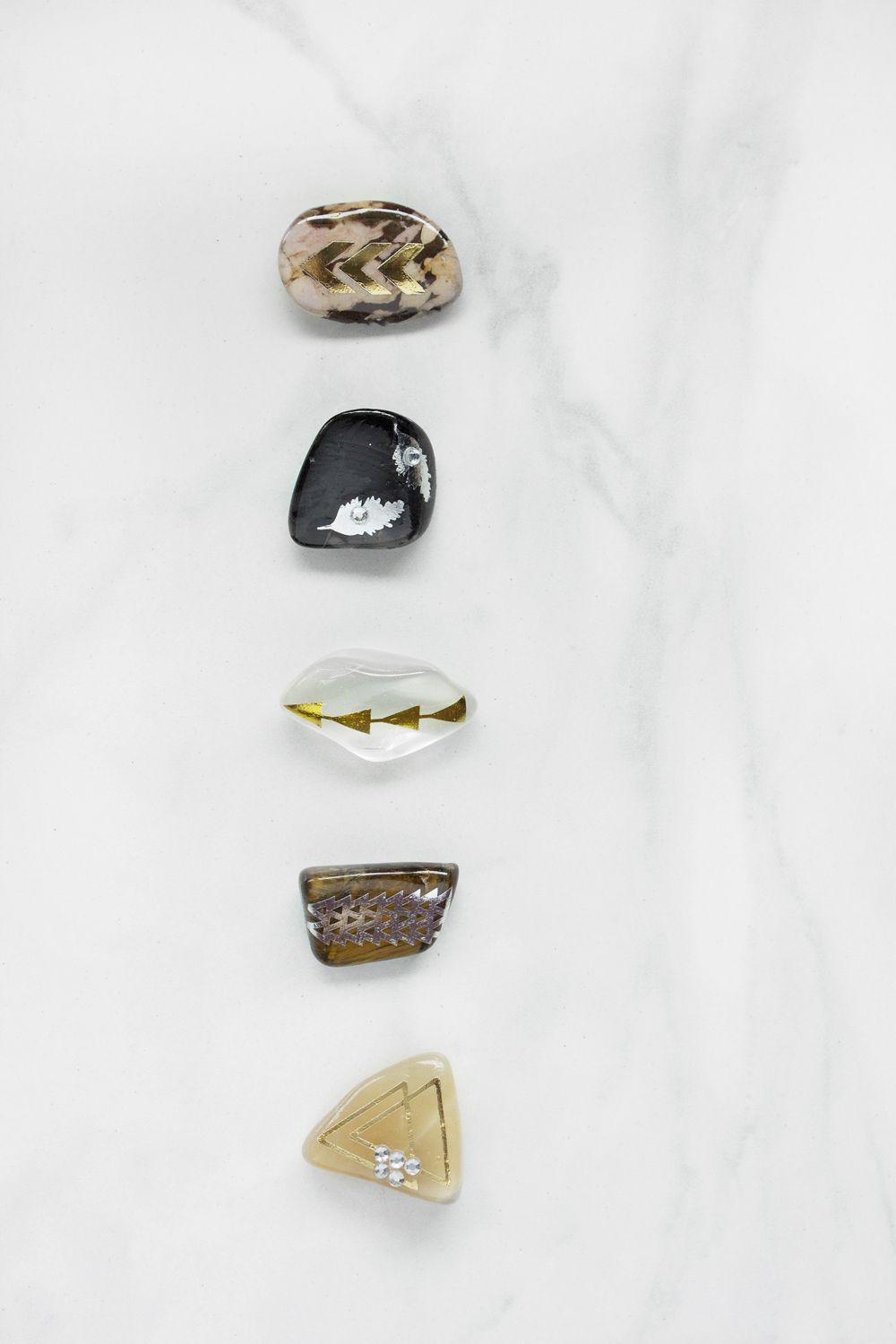 To give your rocks some shiny pizzazz, simply apply the metallic tattoos just how you would on skin. This also works on agate and druzy agate slices. Here's a step-by-step process: