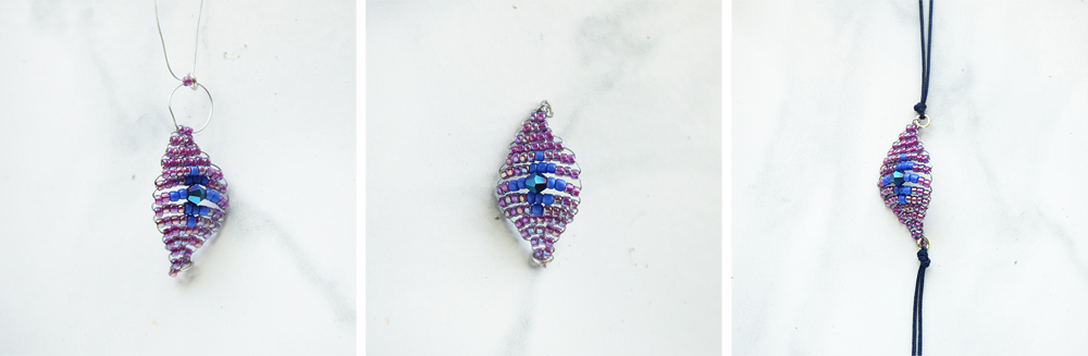For the next layer, 2 seed beads, 2 accents, 1 crystal, 2 accents, and 2 seed beads. After that layer, reverse the order of layers, to close the rest of the eye. Look at the picture above for help!
