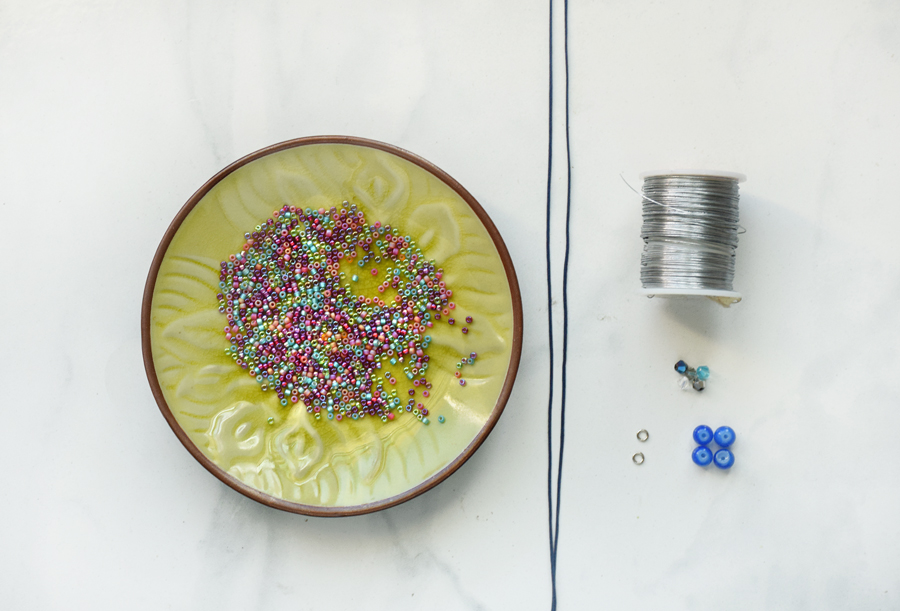 Step 1: Gather materials. Needed are colorful seed beads (I used size 11), .8mm nylon knotting cord, 4mm Swarovski bicones, 6mm glass rounds (some pretty ones here and here ), 4mm jump rings , 28g silver wire, scissors and wire cutters . You will also need superglue to glue the knots.