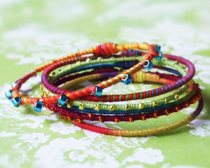 This is just a quick post. After my Rainbowlicious Hoops post, I thought about what else I could cover with embroidery floss (I have a huge bag of it in my room!). Using the same technique, I made a bright bangle set, which turned out great!