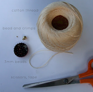 Step 1: Gather materials. Needed are 3mm glass gemstone beads, cotton thread for knotting, scissors, tape, and a bead and crimp for closure.