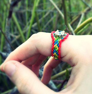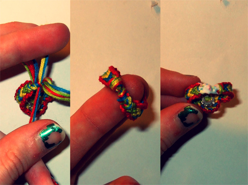 Keep with the chevron pattern till the ring is long enough to fit around your finger. Once long enough, overhand knot all threads to secure.