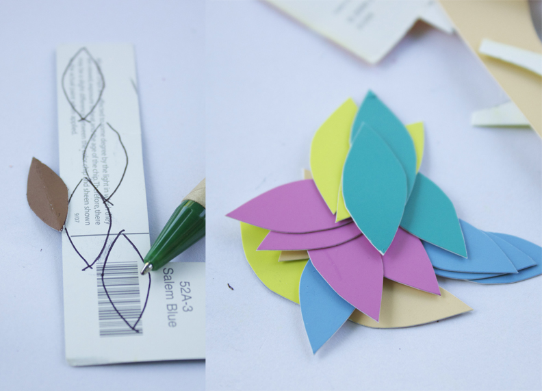 Trace your template on your paint chip underside, and then cut. I used 5 different colors. I cut and used about 16 petals.