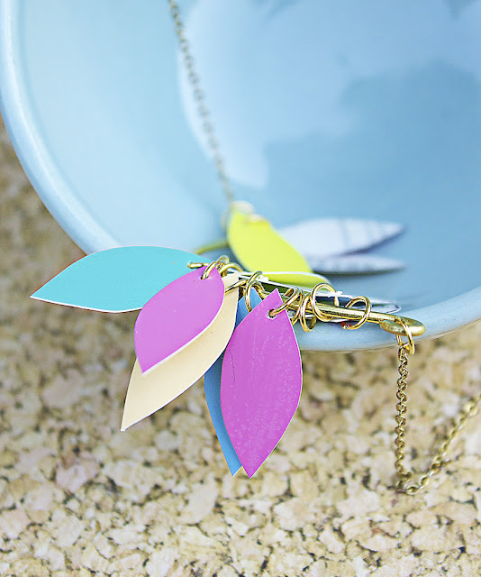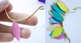 Step 3: Take your wire, cut about 4". Loop one end with pliers, bend into a U shape, and loop the other side. Depending on how big you want your pendant, and how many petals you want, you can cut less or more of the wire. Poke holes through the top of the paint chips. Quickly coat the chips with a thin layer of gloss, for shine and protection.