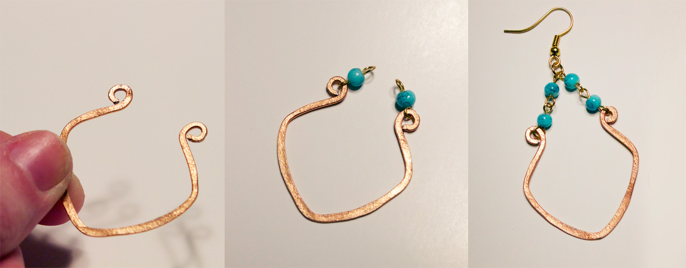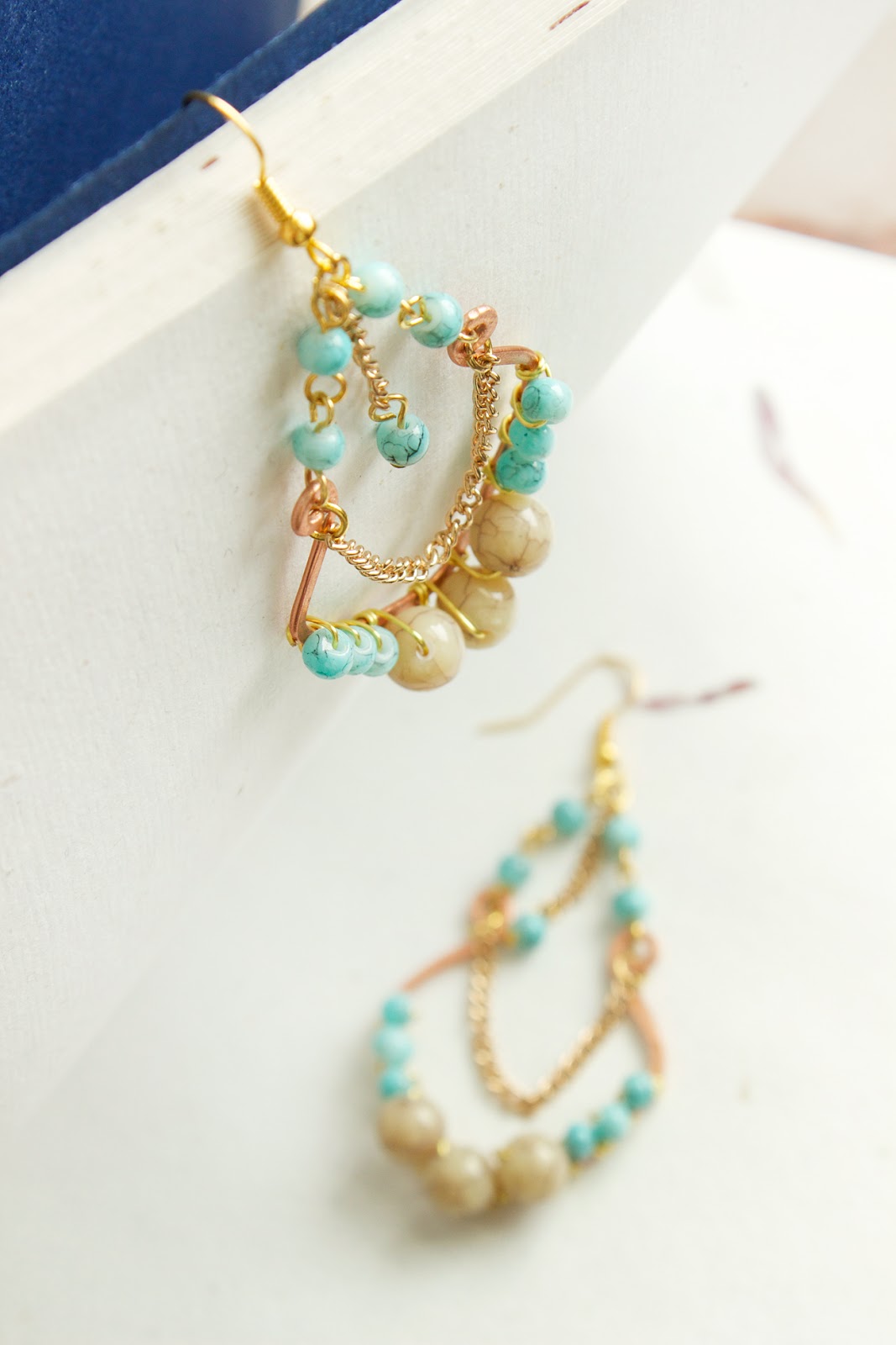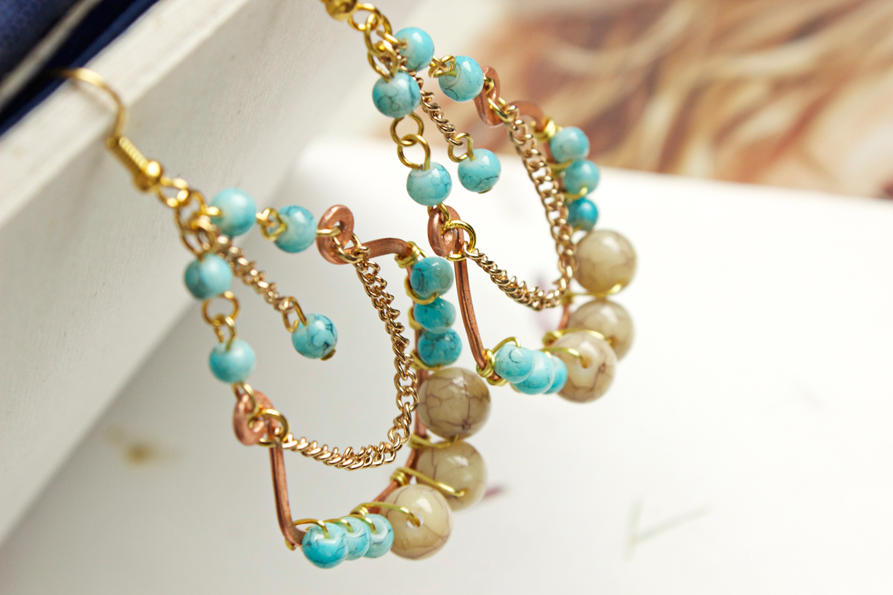 When I first got these turquoise and howlite rounds from bead store PandaHall.com, I knew I wanted to create something with a more neutral color palette. My love for mixed metals spurred the chandelier earring idea, thinking that copper and gold, both "warm" colors, would blend well together.