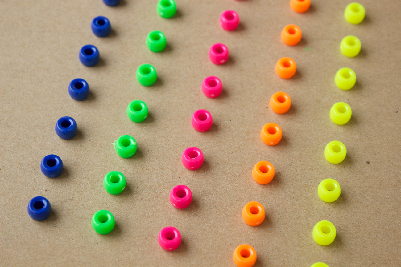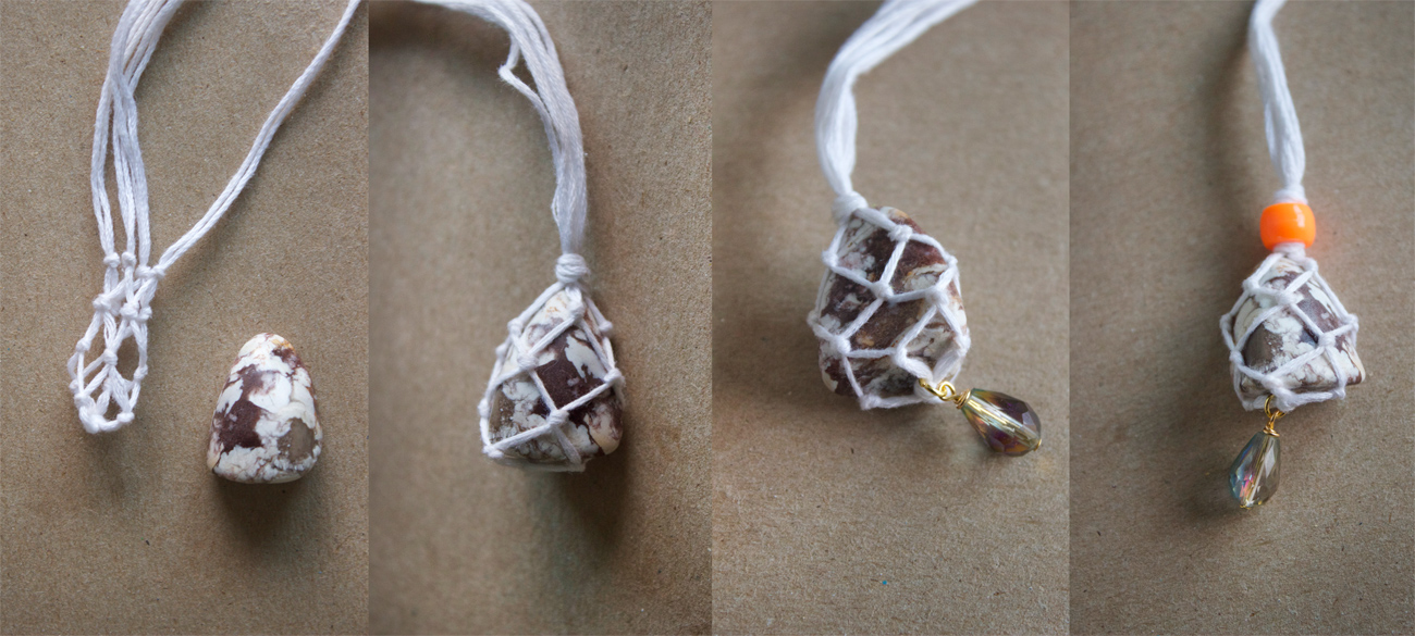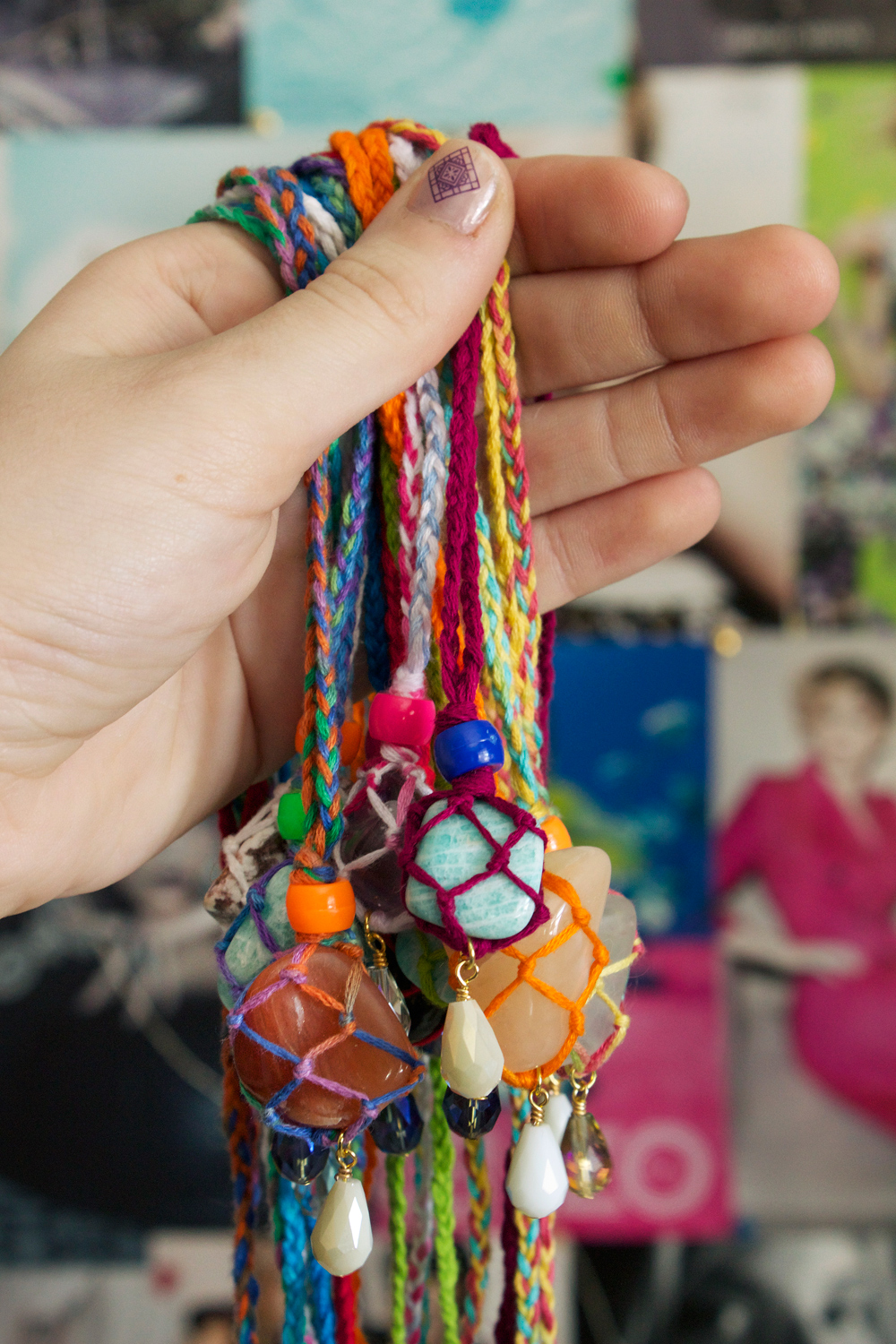 Do this once again, tying each string to the one next to it like in the last step. It should form into somewhat of a pouch. Stick your gemstone in, then tie a tight knot at the top. I added a bead dangle with a jumpring at the bottom of the pouch. I then knotted on a pony bead for a bright neon pop! To finish, divide the strings into two groups of four- braid each group together and then overhand knot to finish. These will be long necklaces, so no clasp is needed!