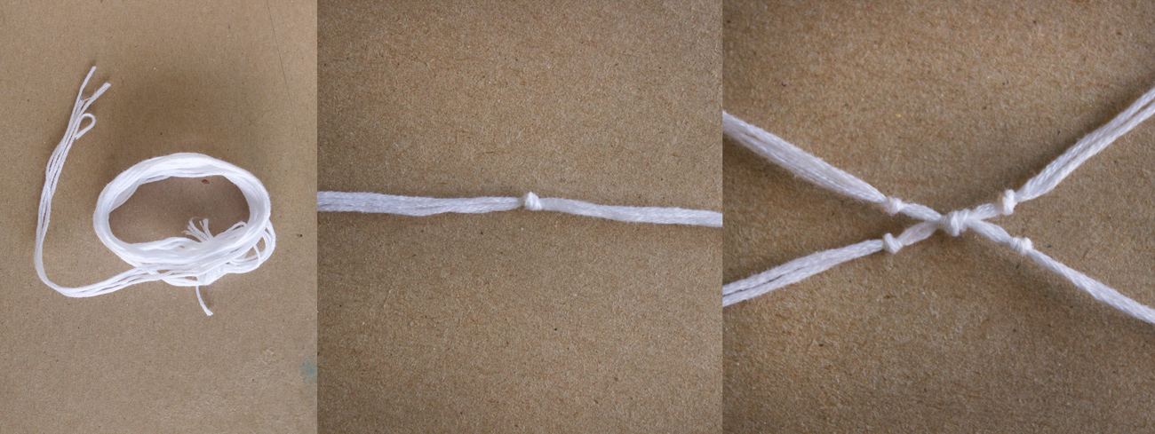 Step 2: Cut four equal lengths of embroidery floss. I cut a little more than 4 feet each time and that leaves me with plenty. Tie all four in an overhand knot right in the center of the lengths. Then, divide each side into two pairings of two strings - tie these in knots together.
