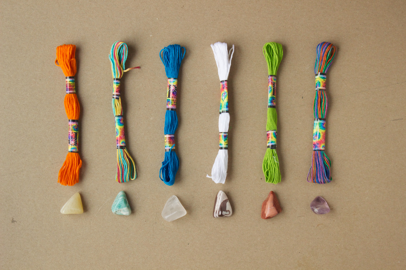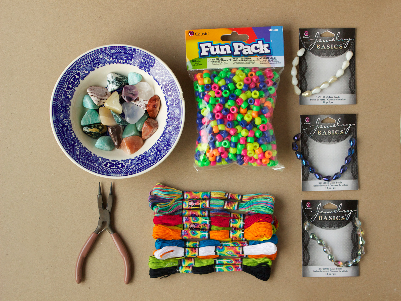 Step 1: Gather materials. You will need embroidery floss, pliers, gemstones - if you don't have a stockpile like I do, you can get a tumbled stone mix from Amazon, pony beads (mine from Cousin), crystal teardrop beads (mine from Cousin Jewelry Basics), jump rings, headpins and scissors.