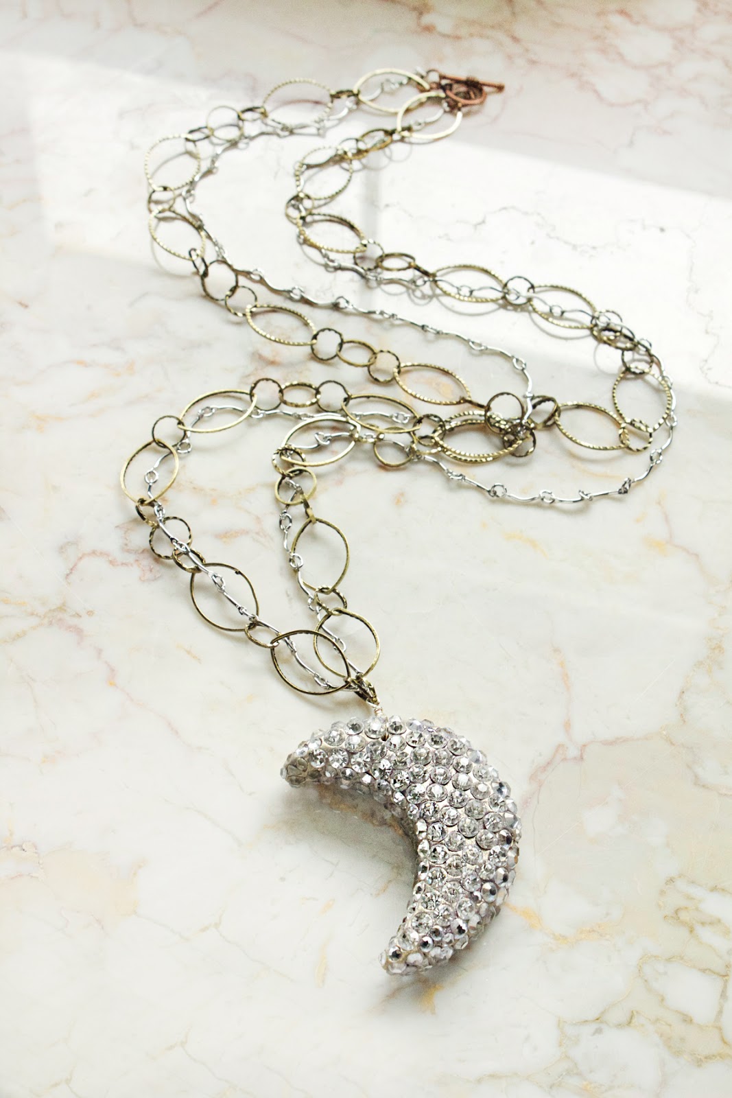 So if you know my style, you know I love anything slightly edgy yet totally sparkly. I was inspired to make this necklace by looking at this Lanvin beauty -- the deep antique gold tones and crescent moon pendant are simply stunning. To make my version, I created a clay moon charm and pressed in glass rhinestone chatons, dusting the clay with - what?! - gold eyeshadow before baking. This is a little trick of mine; dusting polymer clay with shimmer eyeshadow (and subsequently rubbing it in gently) creates a surface sheen that really amps up the luxe look of the clay. Try it, you'll see!