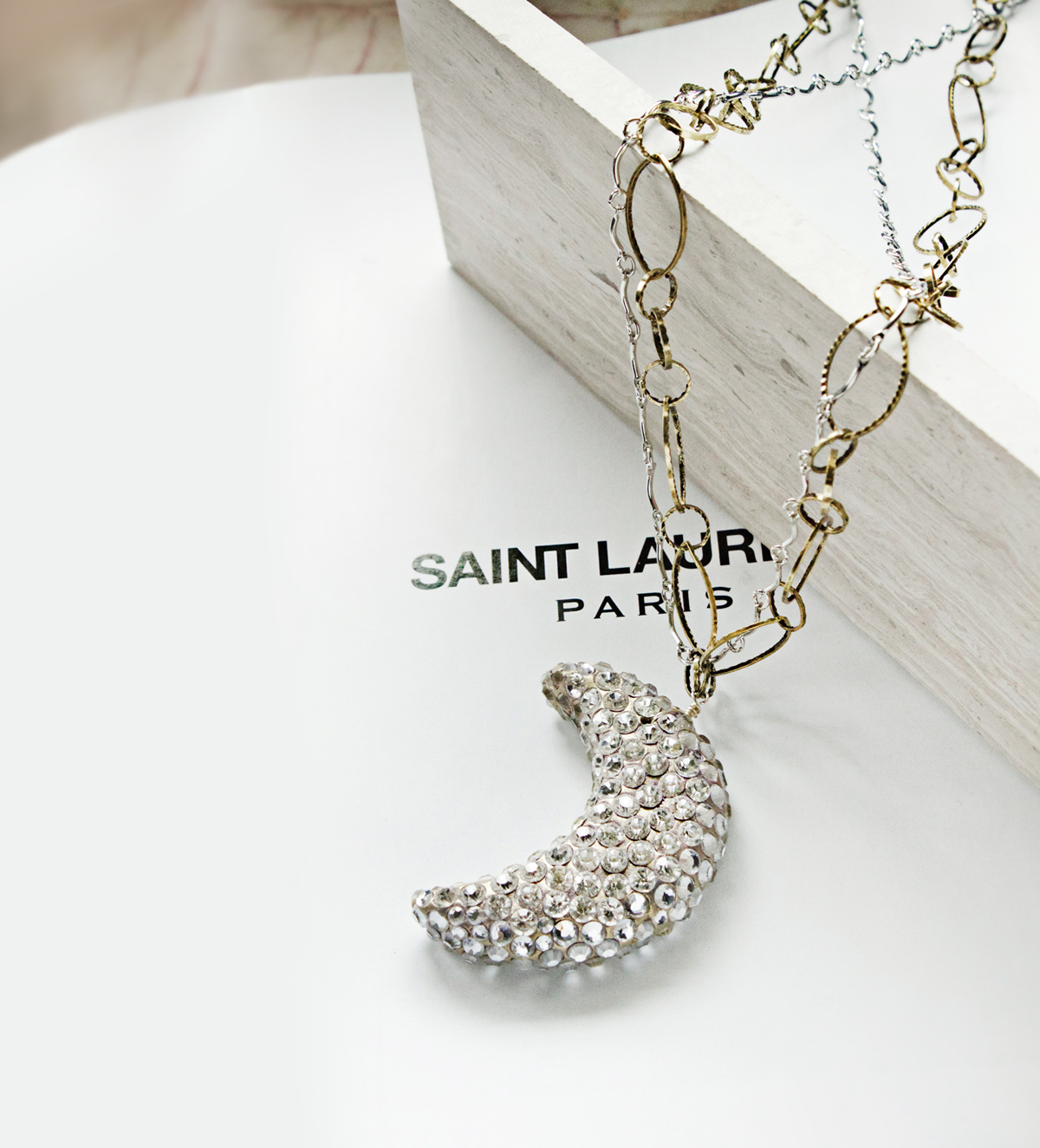 So if you know my style, you know I love anything slightly edgy yet totally sparkly. I was inspired to make this necklace by looking at this Lanvin beauty -- the deep antique gold tones and crescent moon pendant are simply stunning. To make my version, I created a clay moon charm and pressed in glass rhinestone chatons, dusting the clay with - what?! - gold eyeshadow before baking. This is a little trick of mine; dusting polymer clay with shimmer eyeshadow (and subsequently rubbing it in gently) creates a surface sheen that really amps up the luxe look of the clay. Try it, you'll see!