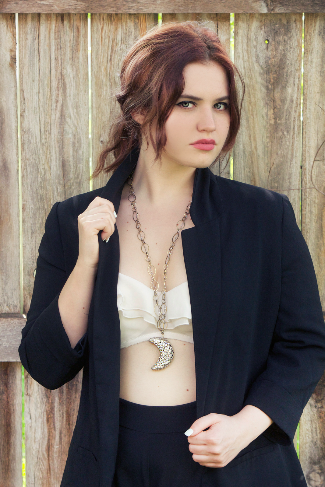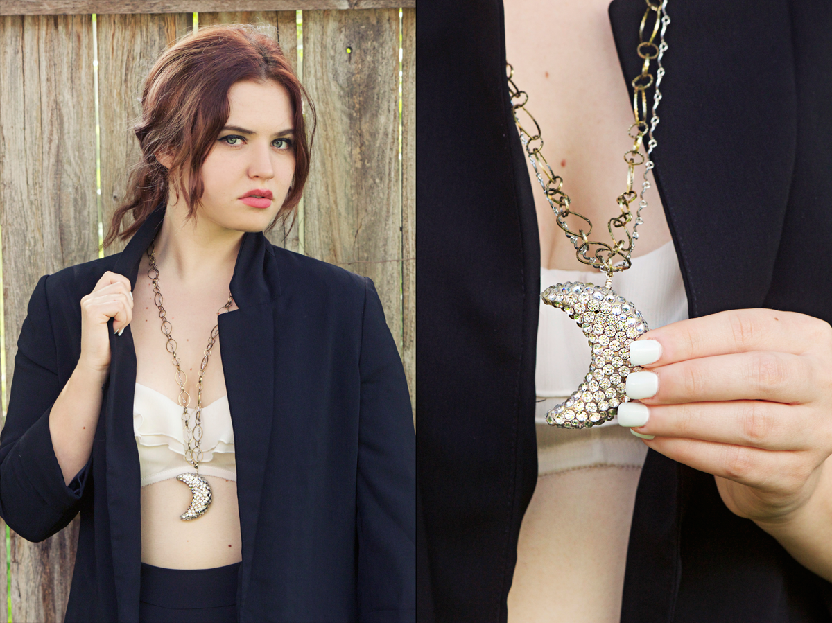 The diamond-cut antique gold chain has a traditional look, but mixing it with more modern silver sleek links creates a contrast that I rather like. Plus, both silver (from the crystals) and a dark gold (from the clay) are present in the pendant, and the two chains bring these elements together. The chains were from Cousin Corporation and the rhinestone chatons from Pandahall. If I were wearing this necklace, I'd pair with a black tunic top, leggings and combat boots. However, fortunately, my trusty model Karlee Dewan is much more adventurous. We styled it with a white crop top, sharp black blazer and black cigarette pants for a modern Madonna-type look. What do you think?!