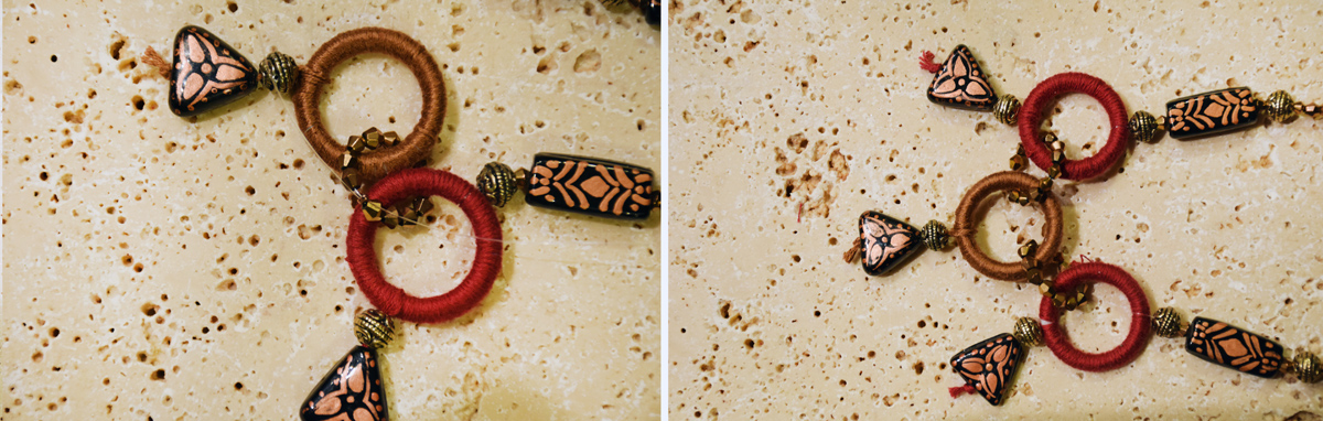 Step 2: Finish wrapping the link. With the excess string, thread on a metal bead, then the folk bead. Tie off at the end. Repeat twice more (I used brown thread on the second link).