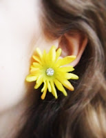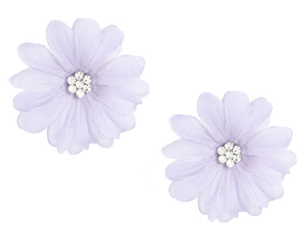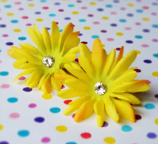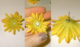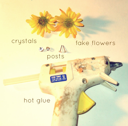 Step 1: Gather materials. Needed are two fake flower heads, two crystals (I used glass cabochons), two earring posts and hot glue.