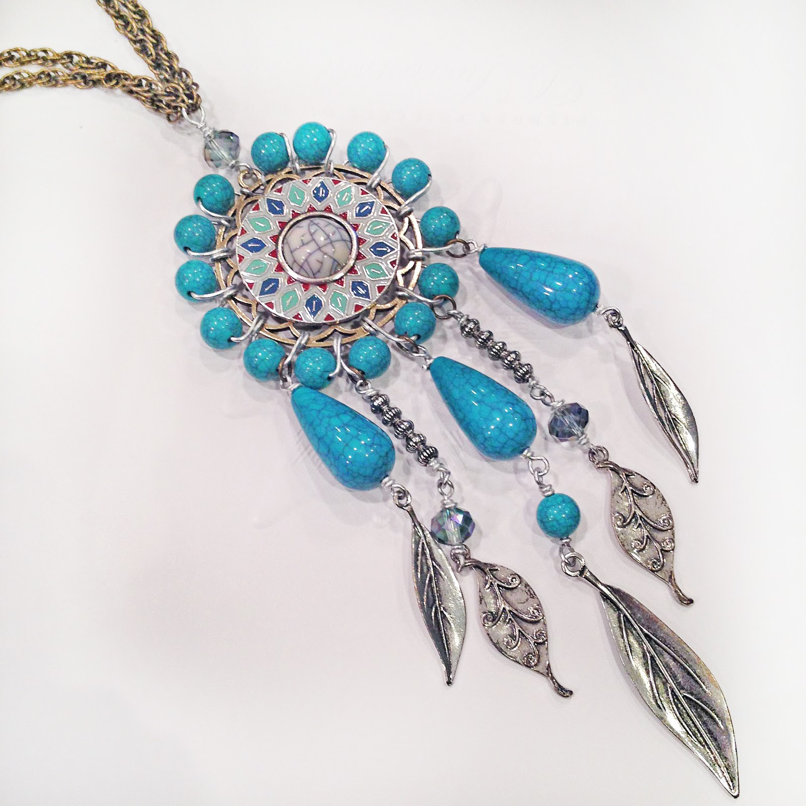 Last retreat, I created my Cosmic Chic set, using black and blue beads and wire in an edgy silhouette. This year, I was inspired by turquoise strands I found to create a woven dreamcatcher-themed set I entitled Hippie Dreams.
