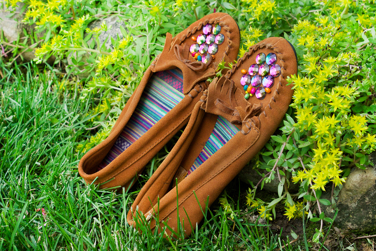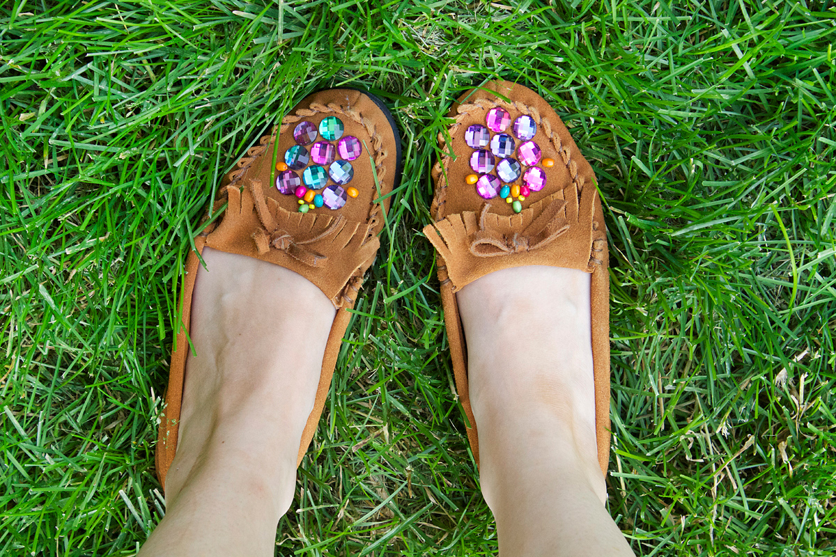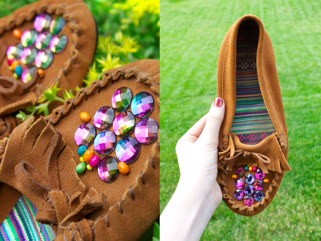 Just some quick sewing and gluing will have your tired moccasins looking supa’ fresh in no time. I think the mix of colors here and those cool iridescent rhinestone flat backs mix perfectly.
