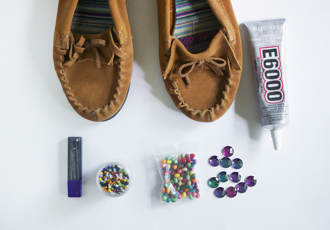 Step 1: Gather materials. Needed are a pair of moccasins, sewing needles, E6000 glue, fishing line, cabochons (Pandahall Tawaian Colorful Flat Back rhinestones), wooden beads (Pandahall Oval Wood Beads), seed beads (Pandahall Opaque Mixed Color Beads).