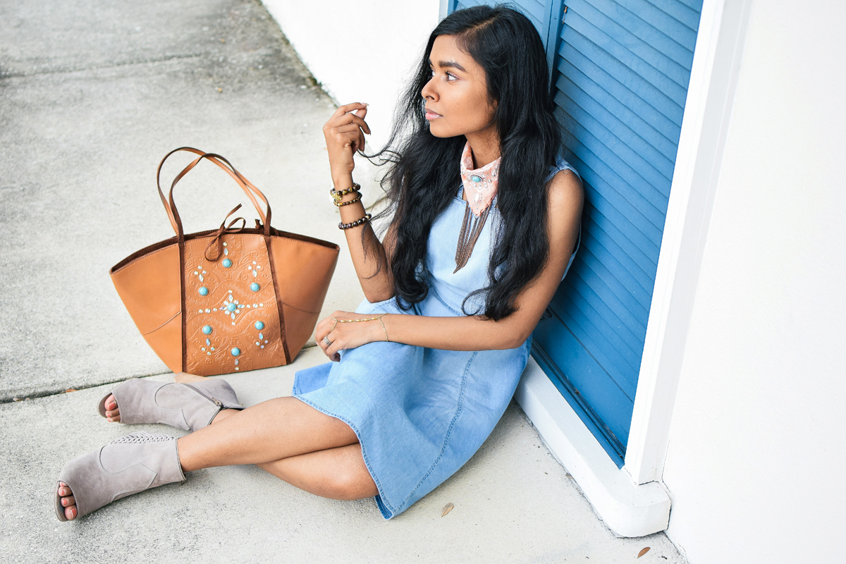Finally, we ended with a Southwest-type getup featuring one of my Boho Bandanas - read more about those here! - and crystallized purse. I took a vintage bag and added modern bling with some turquoise cabochons and flatback crystals - it could not be easier to recreate at home! If you’ve got old purses that are in need of a makeover, I say add sparkles!