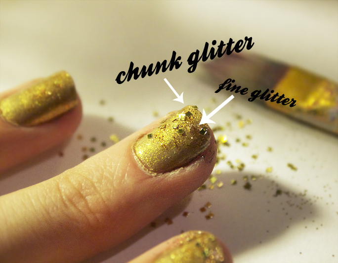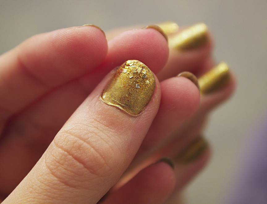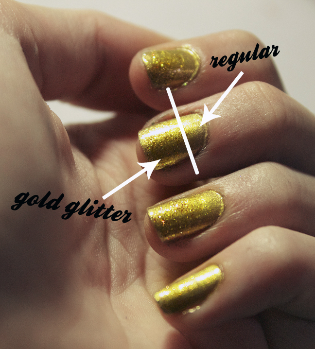 Step 3: With the gold glitter nail polish, take a small glob and paint evenly only the top 2/3rds of your nail, leaving the bottom third the plain gold color.